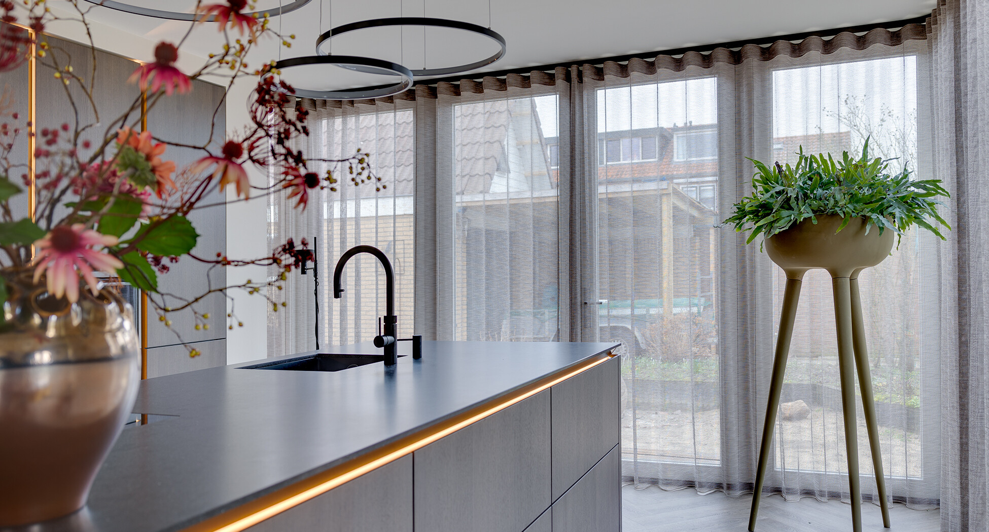 Nu de vloeren gelegd zijn en de gordijnen en raamdecoratie opgehangen, is Willeke ‘goed blij’ met het eindresultaat. En niet alleen omdat het nieuwe interieur een pláátje is. “We hebben nu in de woonkamer een visgraat pvc-vloer met een mooie houtstructuur. Die is ook erg onderhoudsvriendelijk. Vroeger hadden we een parketvloer, die moest twee keer per jaar in de was gezet…”. Ook een aanrader wat Willeke betreft: Luxaflex MegaView jaloezieën. Die geven overdag meer licht en kunnen het raam door de unieke dubbele lamellen ook helemaal afsluiten.